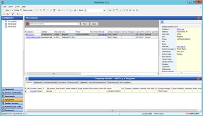 Contacts are recorded in the Companies and Persons modules. These allow you to register basic information about companies (suppliers, service companies) and the people related to them. The aim of these modules is not only to provide the users with basic information for common correspondence and business activites, but also to create a basic connection between the other modules of the application.